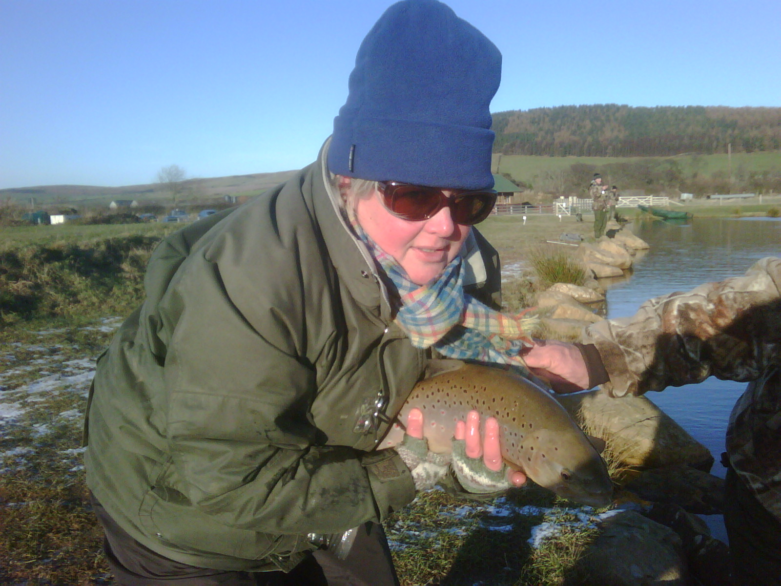 The last peg and Tabitha said “i don’t think i’ll catch my first fish” the gods then shone and Tabitha’s rod bent double, line chasing across the water a brown trout firmly hooked. The game of landing her first fish securely, commenced. Thankfully Tabitha had the assitance of one of the Chatton regulars who skillfully netted the fish and then said its got to go back its a brown trout about 6 to 7lb. Well we had to have a photo, though Tabitha was more concerned about putting the fish safely back.