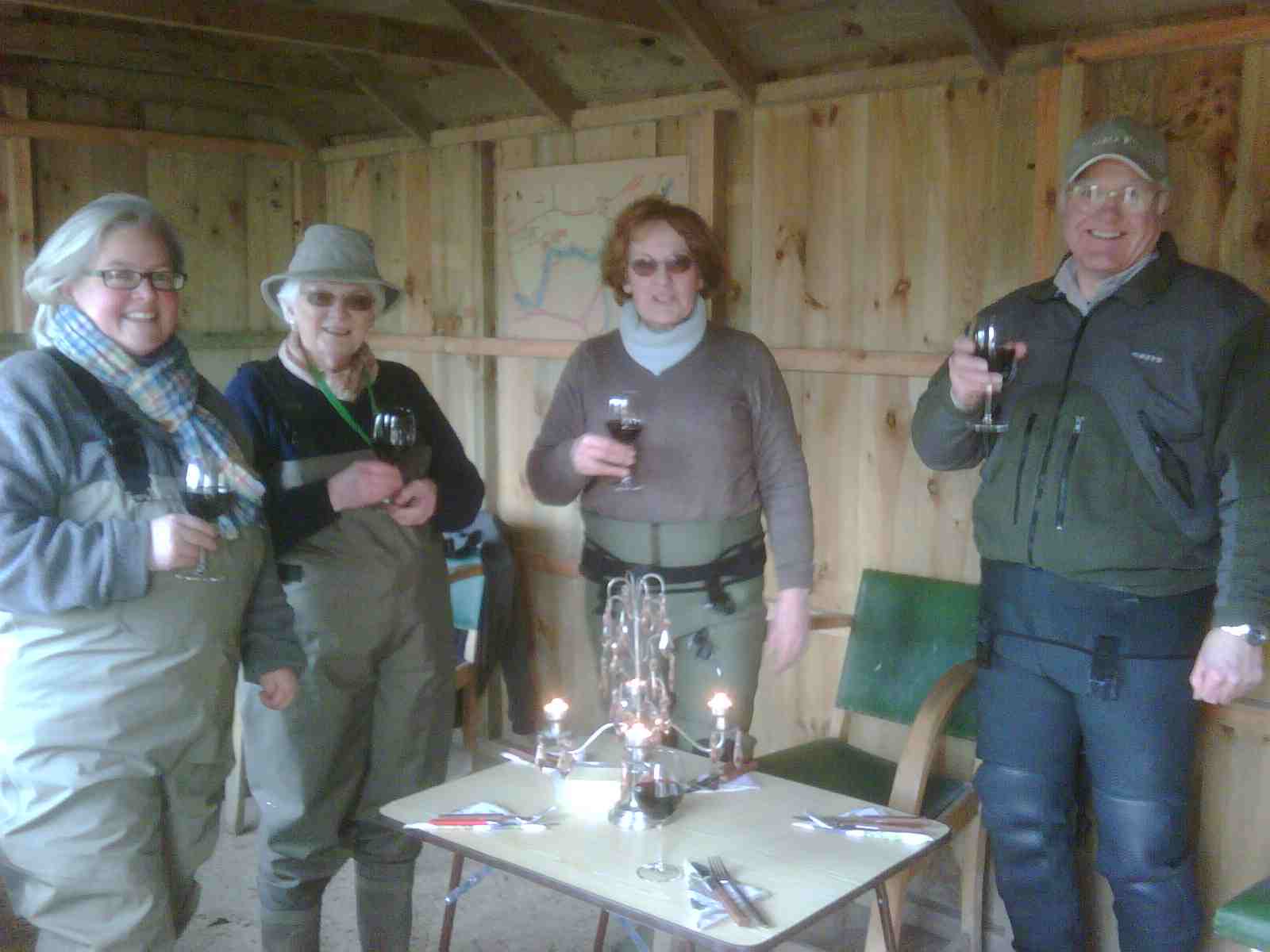 We met at 10.00am to find that the ghillies hut (which is a shed) had been transformed with tables, chairs, table cloth, mini cooker,picnic baskets, china mugs and candles lit. Over coffee and cake we laughed at the candelabra I’d bought and checked the barbless flies from Paul little.