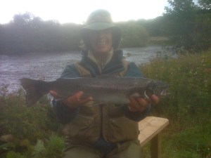 Casting through the pool and desperately trying to get a decent line out, my fly fell in a heap into the Tyne; then came a tug and a ssss’d of my line, the reel screamed (thank goodness i’d listened to Paul Little and remembered to free my disc drag), I played the salmon with help from Sarah, who held the net. My hands were shaking when I finally landed my first salmon with a sense of achievement’